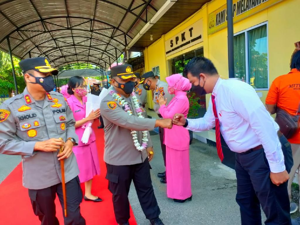Setelah melewati gerbang pora, keduanya berpamitan sambil menyapa satu persatu personel yang berjejer sepanjang jalan menuju gerbang keluar Polres Kampar. Banyak mata anggota berkaca-kaca saat melepas kepindahan AKBP Mohammad Kholid yang dikenal dekat dengan anggota ini.