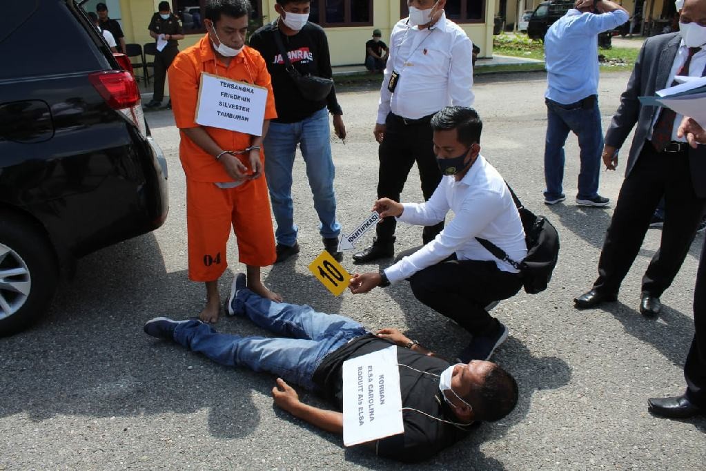 Rekontruksi kasus pembunuhan ini diperankan langsung oleh tersangka FT alias Erik, sementara untuk korban diperankan oleh orang lain sebagai peran pengganti.