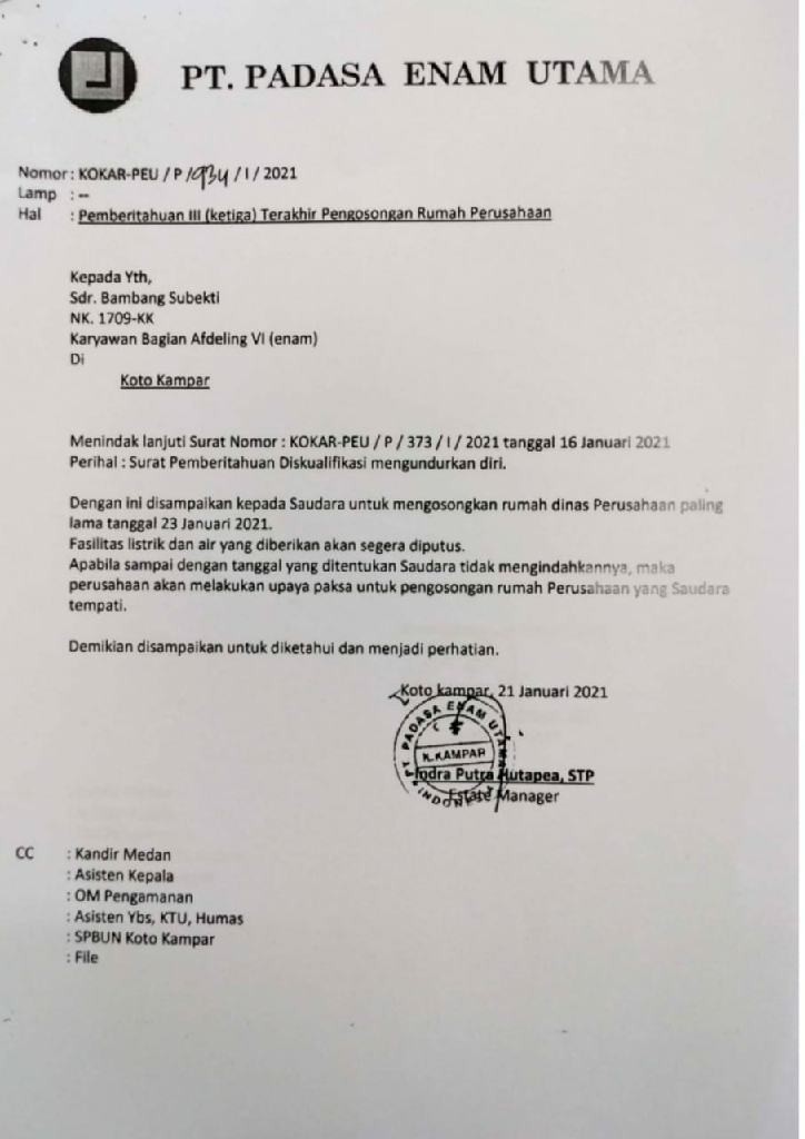 Sebelumnya pihak perusahaan juga telah 3 kali mengirimkan surat pemberitahuan atau perintah pengosongan terhadap rumah atau aset perusahaan tersebut yang masih digunakan eks karyawan, namun hal itu diacuhkan oleh Eks Karyawan dan mereka tetap bertahan di perumahan milik perusahaan tersebut.
