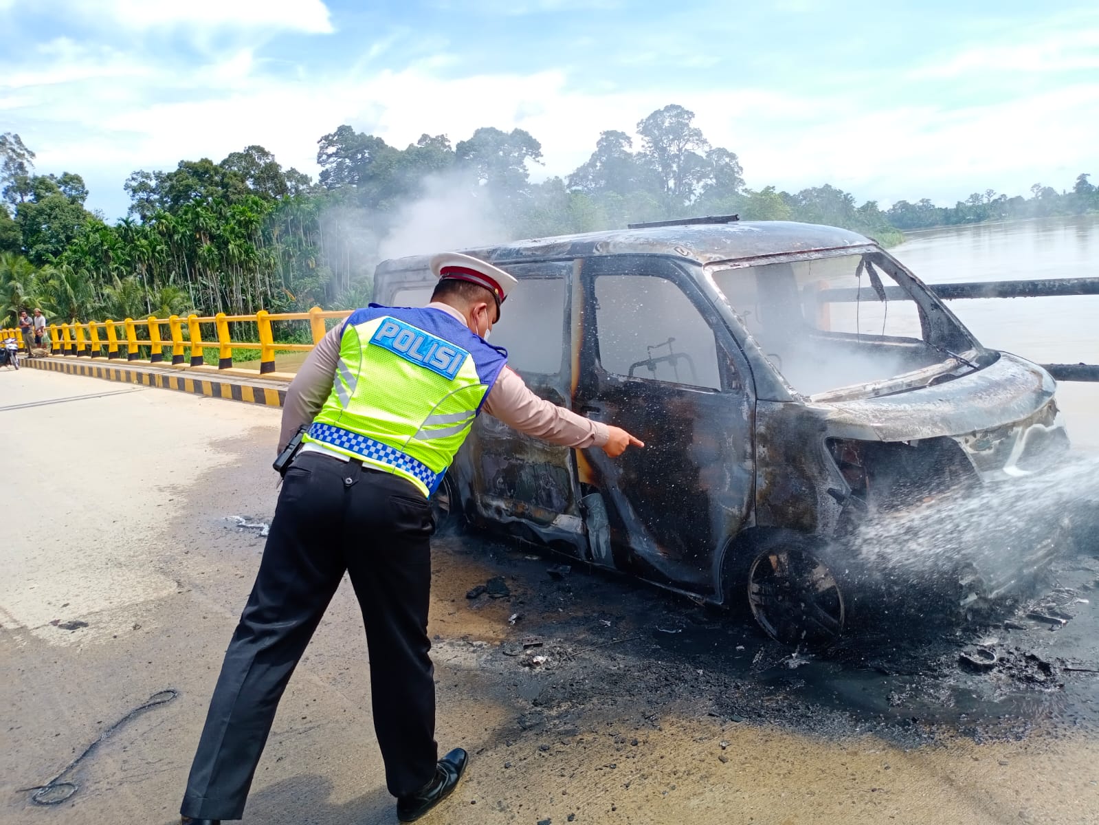 Selanjutnya, sekira pukul 09.00 WIB, pemilik mobil tersebut mendapat informasi bahwa mobil yang diparkirkan di jembatan tersebut mengeluarkan asap dari dalam mobil, setelah mendapat informasi tersebut pemilik mobil langsung mendatangi TKP dan benar di temukan mobil dalam keadaan terbakar.