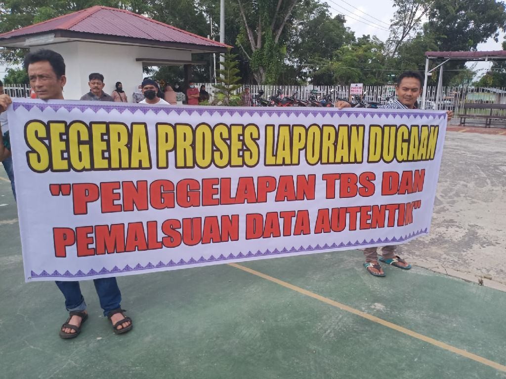 KAMPAR - Ratusan warga Desa Pangkalan Baru Kecamatan Siak Hulu yang tergabung dalam Forum Masyarakat Peduli Koperasi Petani Sawit Makmur (Kopsa-M), Rabu siang (02/02/2022) menggelar aksi damai di halaman kantor Pengadilan Negeri Bangkinang.