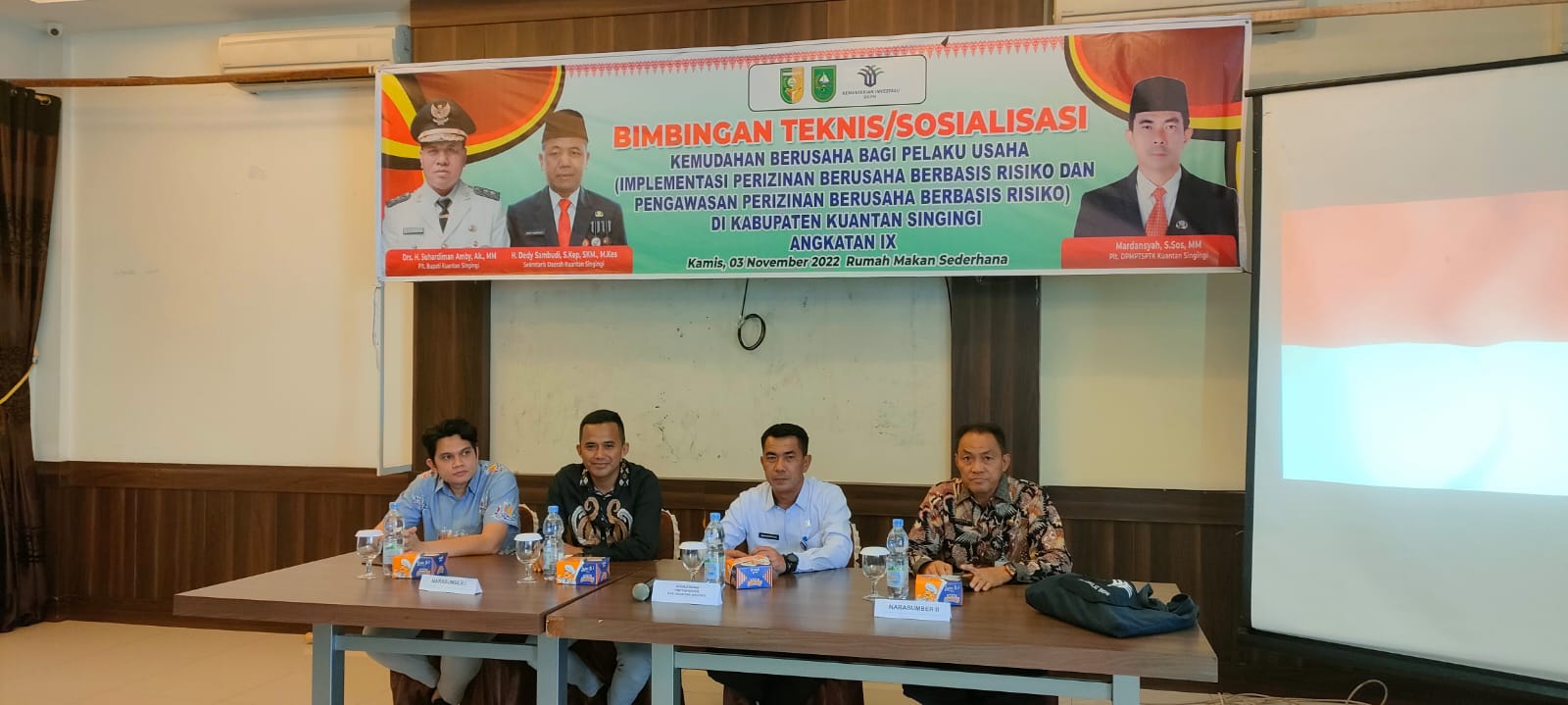 KUANSING - Guna memberi kemudahan berusaha bagi pelaku usaha , Dinas Penanaman Modal Pelayanan Terpadu Satu Pintu dan Tenaga Kerja Kuansing ( DMPTSP Naker ) Kuansing, menggelar pelatihan di buka Plt Kadis, Mardansyah, S.Sos, MM Rabu ( 02/11/2022 ) siang di Teluk Kuantan .