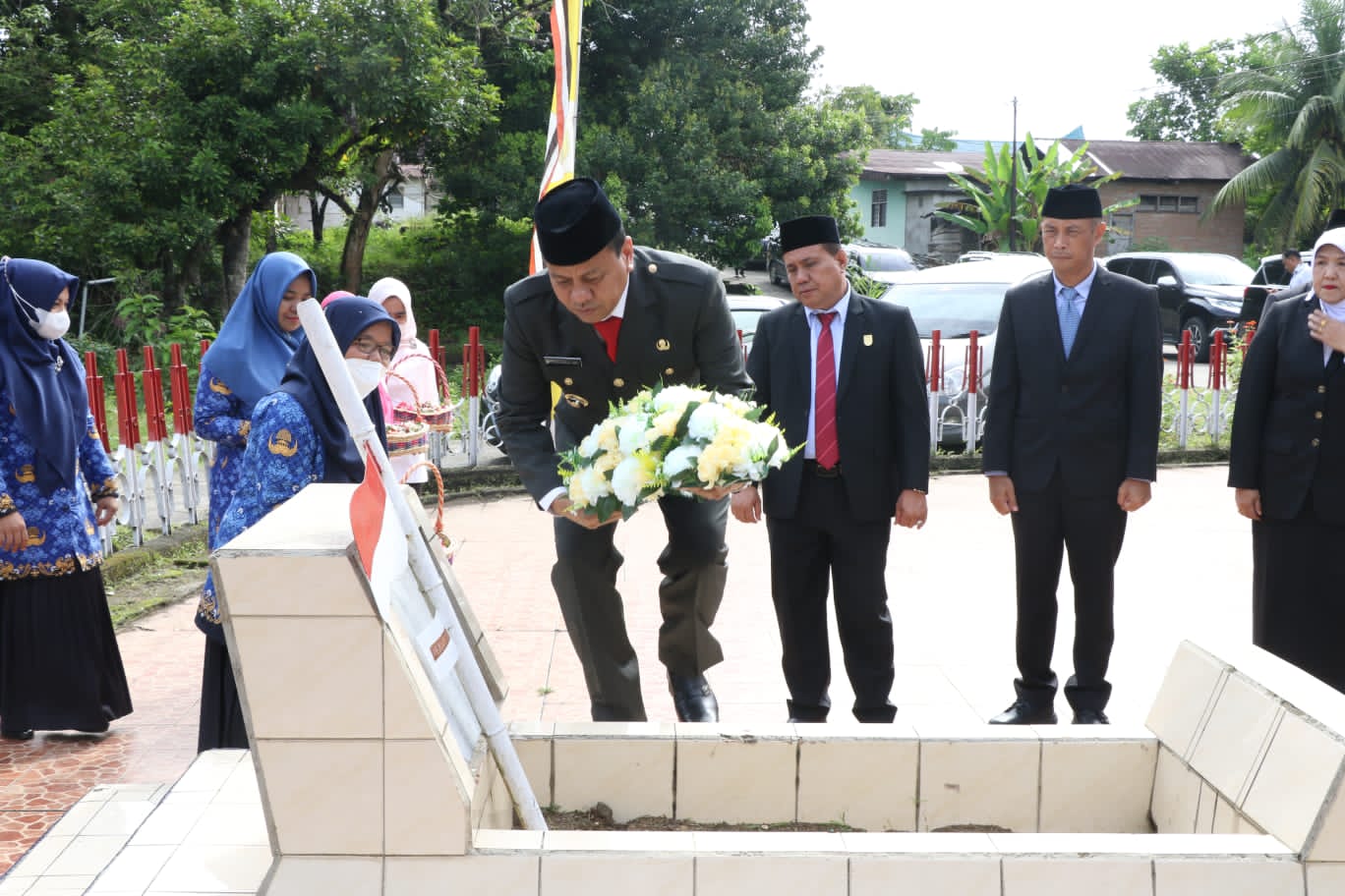 KUANSING - Usai menjadi Inspektur Upacara pada peringatan Hari Pahlawan , 10 November 2022 di lapangan Pemda Kuansing , Kamis pagi, Sekda, H Dedy Sambudi ,SKM.M.Kes les beserta Forkopimda dan Kepala OPD , Plt Bupati Kuansing Drs H Suhardiman Amby melakukan tabur bunga di Taman Makam Pahlawan KH Umar Usman , di Desa Koto Teluk Kuantan .