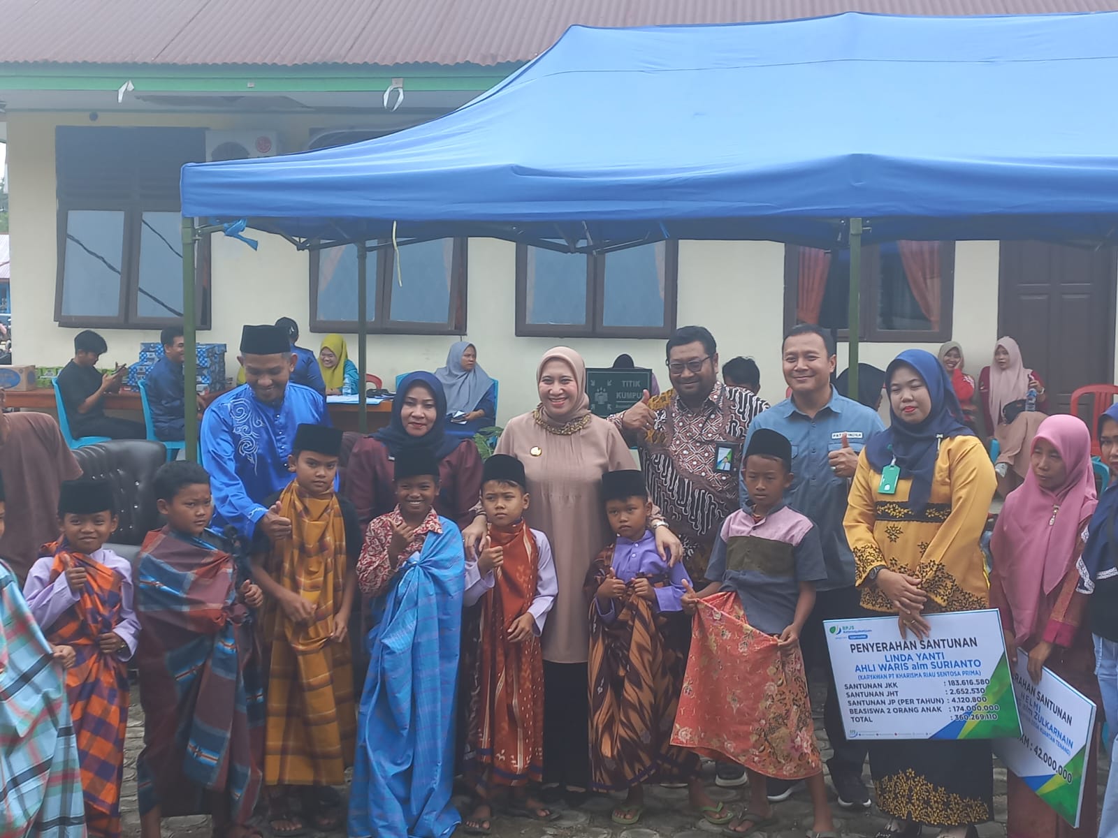Pada kesempatan ini, Rezita juga menyerahkan secara simbolis santunan Jaminan Kematian (JKM) kepada ahli waris almarhum Zulkarnain, anggota BPD Desa Kuantan Tenang dan santunan kepada ahli waris almarhum Surianto, karyawan PT Kharisma Riau Sentosa Prima. Penerima santunan pertama ahli waris almarhum Zulkarnain, anggota BPD Desa Kuantan Tenang. Manfaat yang diterima adalah Santunan Kematian Rp.42.000.000.