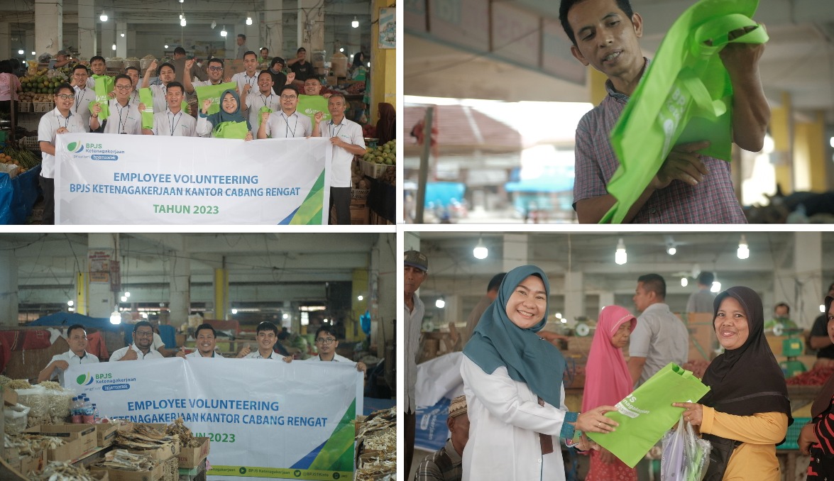 Di kegiatan yang sama BPJS Ketenagakerjaan Rengat juga mengadakan Employee Volunteering bertemakan “Go Green” dengan membagikan ke para pedagang dan pembeli berupa tas belanja Godie Bag untuk mengurangi penggunaan pelastik.