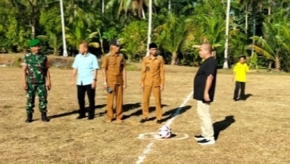 Peresmian pembukaan perayaan olahraga di Desa Sungai Ulu ditandai dengan tendangan bola secara simbolis oleh Ketua Komisi I DPRD Natuna, Wan Aris Munandar dan Camat Bunguran Timur, Hamid Asnan. (RK/Zani)
