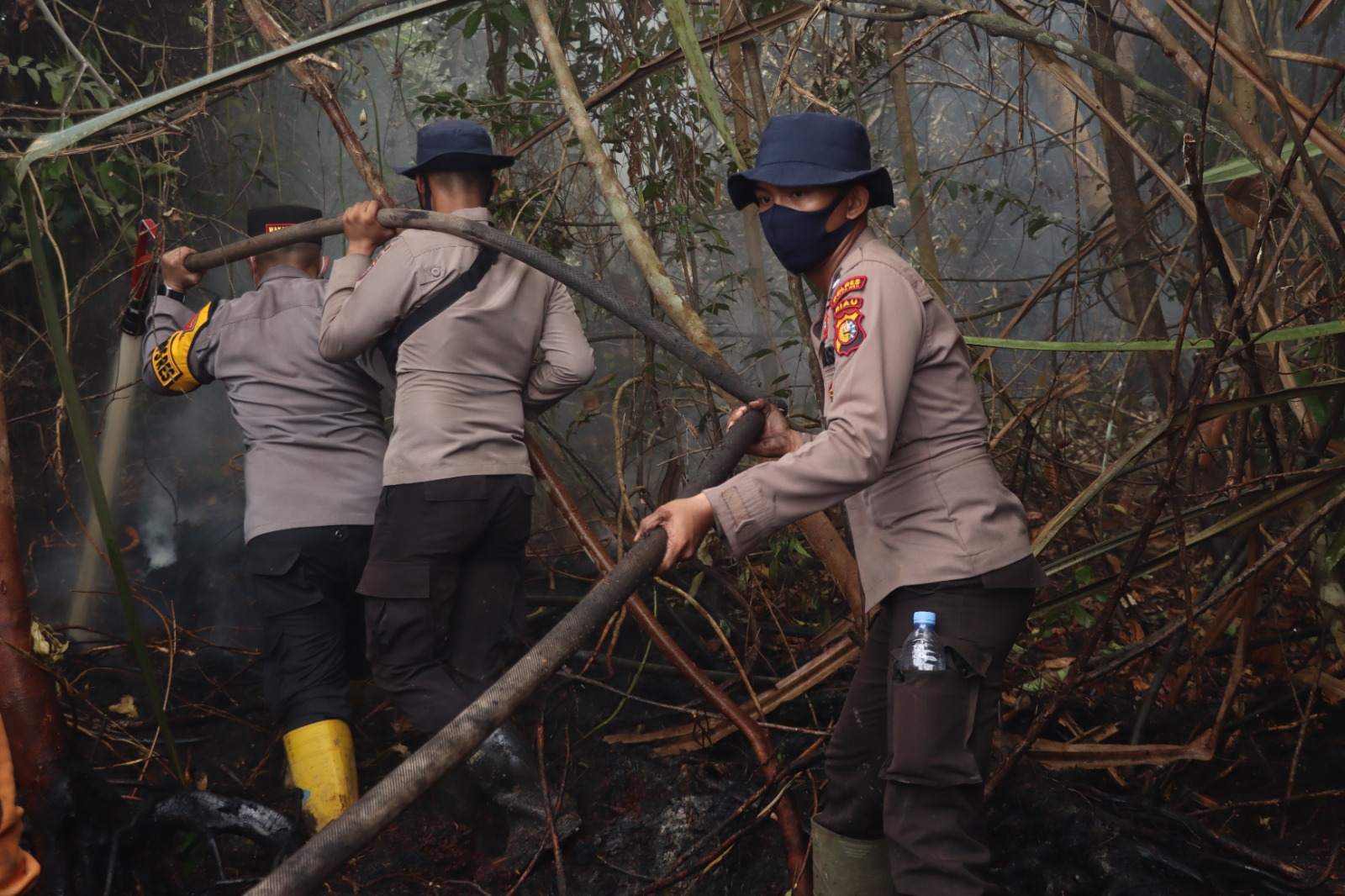 INHU - Personel gabungan dari Kepolisian resor Indragiri Hulu (Polres Inhu), kodim 0302 Inhu,BPBD,MPA,Satpol PP dan masyarakat terus melakukan upaya pengendalian dengan pemadaman dan pendinginan di lokasi kebakaran di desa pulau gelang kecamatan kuala cenaku kabupaten Indragiri Hulu
