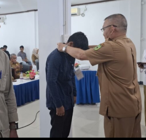 Asisten II Bidang Perekonomian dan Pembangunan, Basri mengalungkan tanda nama pada peserta pelatihan.