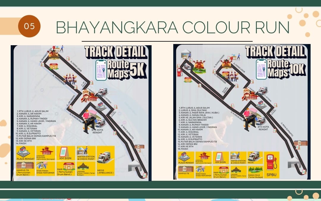 Adapun rute Bhayangkara Colour Run 5K dan 10K menyusuri sejumlah jalan utama seperti Jalan A. Yani, S. Parman, Jend. Sudirman, Lintas Selatan, Brigjen Katamso, Pasar rakyat , Swadaya, jalan Sultan hingga Rengat–Tembilahan. Arus lalu lintas di area ini akan dialihkan dan dikendalikan untuk kelancaran serta keamanan peserta lari dan pengunjung festival.