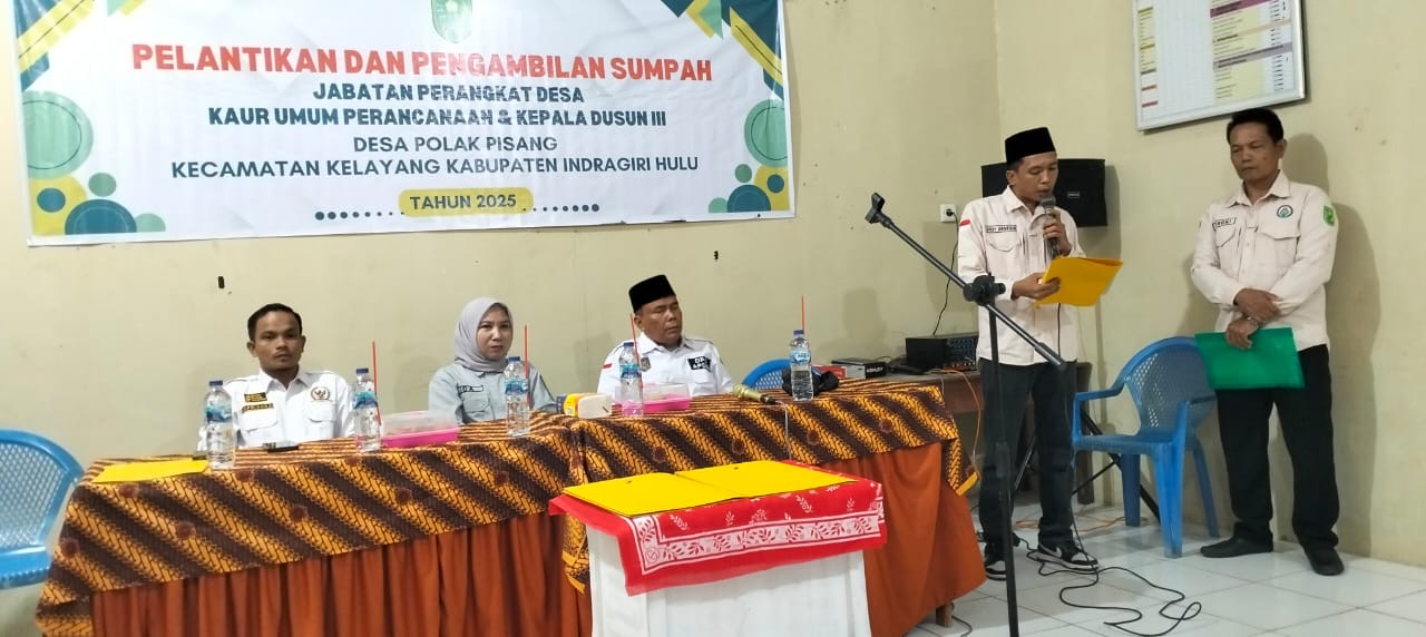 INHU - Suasana khidmat menyelimuti Aula Kantor Desa Polak Pisang, Kecamatan Kelayang, Kabupaten Indragiri Hulu (Inhu). Dalam suasana penuh kekeluargaan tersebut, Pemerintah Desa Polak Pisang secara resmi melantik dua perangkat desa baru sebagai bagian dari komitmen untuk memperkuat tata kelola pemerintahan serta meningkatkan kualitas pelayanan publik di tingkat desa, Rabu (24/9/2025).