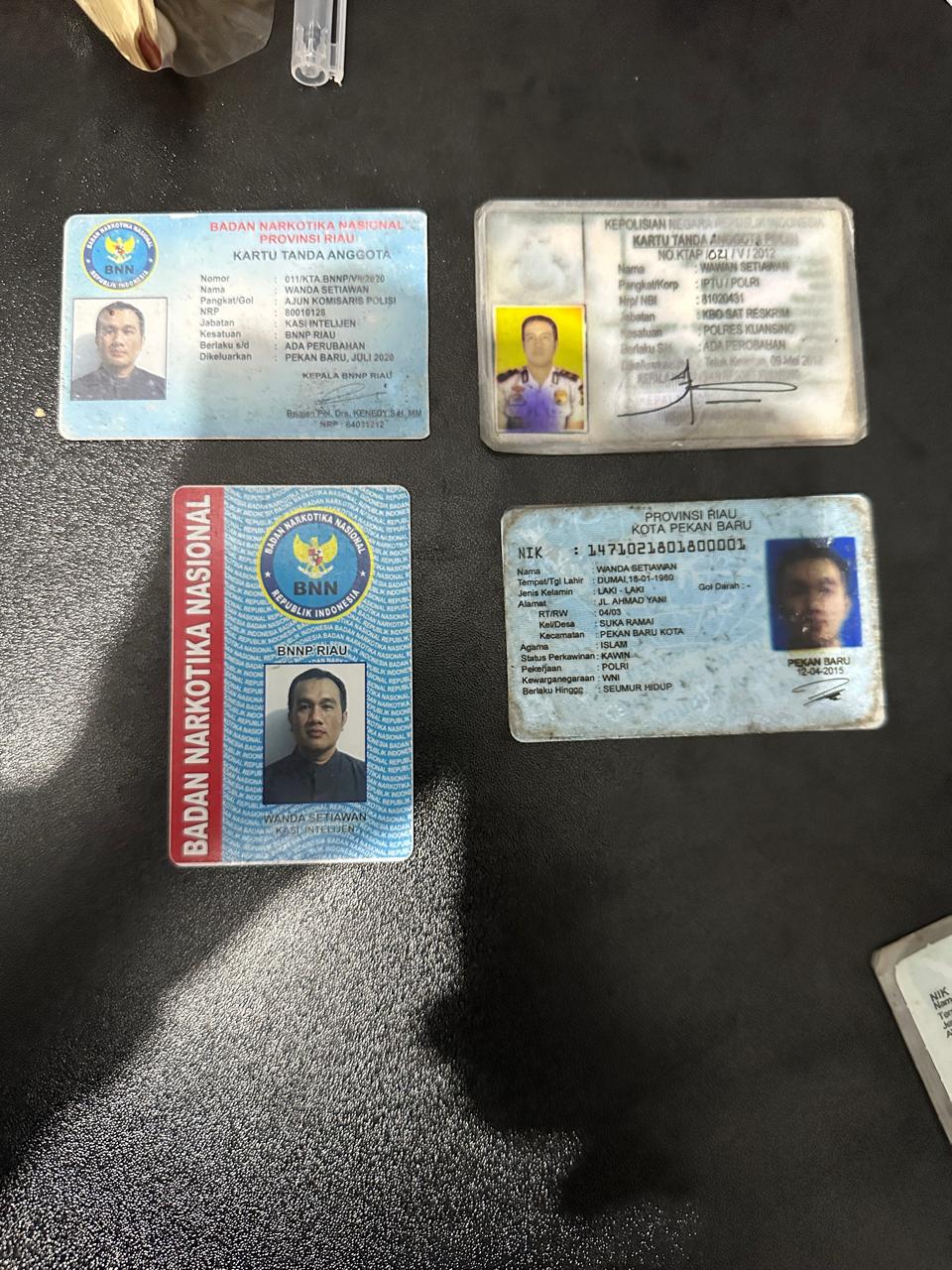 Setelah dilakukan penggeledahan kamar (WS) ditemukan bukti KTA BNN Palsu, ID Card BNN Palsu, Lencana BNN, KTA Polri Palsu, KTP dg (Pekerjaan Polri), Kep Anggota BIN Palsu, dan Baton Stik Polri.