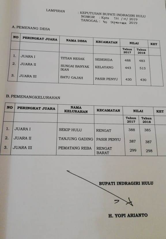 Kasi Evaluasi Perkembangan Desa dan Kelurahan, Muhammad Alfian S.IP saat ditemui, 1 Oktober 2019 menyampaikan bahwa berdasarkan Surat Keputusan Bupati Indragiri Hulu nomor Kpts. 531/IX/2019 tentang pemenang lomba desa dan keluarahan tingkat kabupaten Inhu tahun 2019.