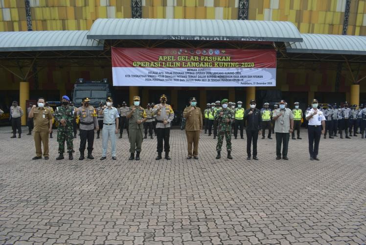 PEKANBARU - Kapolresta Pekanbaru Kombes Pol H. Nandang Mu'min Wijaya S.I.K, M.H, bersama unsur Forkompinda Kota Pekanbaru menghadiri Apel Gelar Pasukan Operasi Lilin Lancang Kuning 2020 di Stadion Kaharudin Nasution Rumbai, Pekanbaru, Senin (21/12/20) pagi.