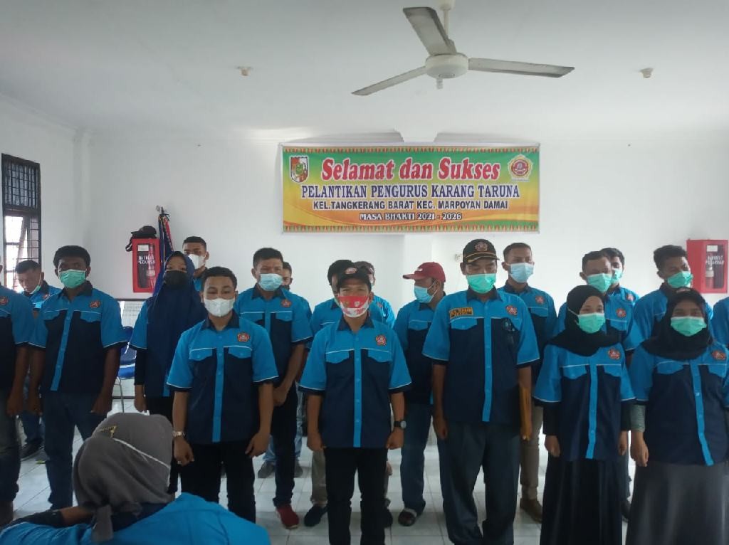 PEKANBARU - Pelantikan pengurus Karang Taruna Kelurahan Tangkerang Barat (Tangbar) Kecamatan Marpoyan Damai, Pekanbaru masa bhakti 2021-2026 diadakan di aula kantor Kelurahan Tangkerang Barat Jalan Gulama pada Minggu (12/04/) sekira pukul 14.00 WIB.
