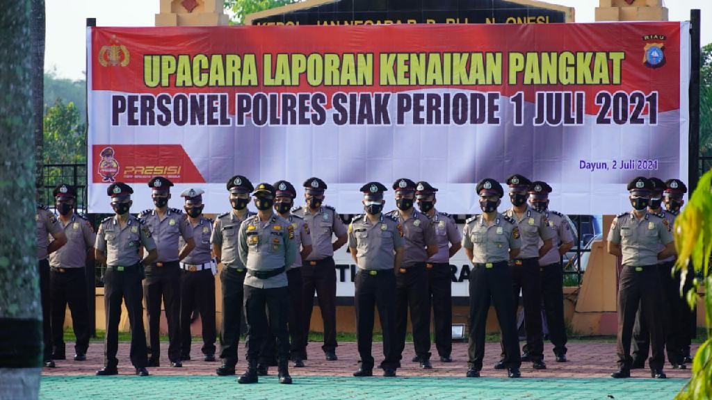 Secara seremoni peresmian kenaikan pangkat tersebut melalui upacara Korps Raport Kenaikan Pangkat Personel di Markas Polres Jalan Lintas Perawang Siak KM 70 Dayun, Jumat (2/7/21) pagi.