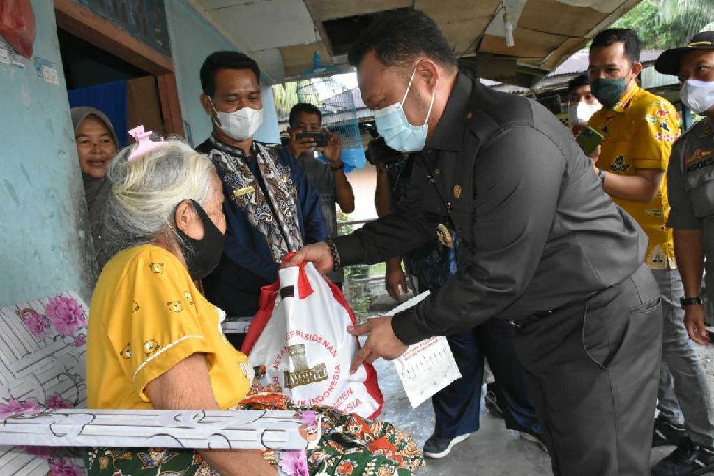 Usai pelantikan Bupati berkesempatan menyambangi rumah masyarakat yang miskin, untuk menyerahkan paket bantuan sembako dan masker di Desa Simalinyang Kampar Kiri Tengah.